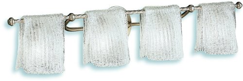 This unique bathroom fixture gives the impression of a towel bar, but these "towels" are actually shades made of ice glass which can be removed for easy cleaning. Uses four 60-watt candelabra bulbs (not included). DL # 1233.